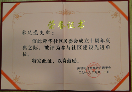 值此舜華社區(qū)居委會成立十周年慶典之際,睿達(dá)汽車服務(wù)連鎖黨支部——被評為參與社區(qū)建設(shè)先進(jìn)單位。
